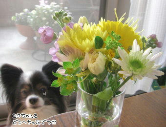 (´д`;)目で訴えるあっクン。(可愛いお花をいただきました♪)
