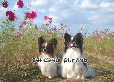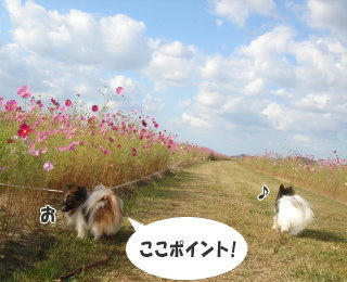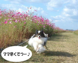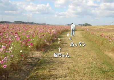あら、この日特に気温が低く感じましたけど、海はなお更寒かったでしょうね~~風邪など引かれてませんか?私ははい!少々のことじゃ風邪引かないみたいです(笑)ついこの間まで暑い~って言ってたのに、もう寒い~ですからねぇ(^.^; 遠賀川のコスモス、かな~り広い範囲に咲いているので、少々見物客がいても、わんこも一緒にのんびりお散歩できますよ♪風あらもはしゃいでました(´∀`*)