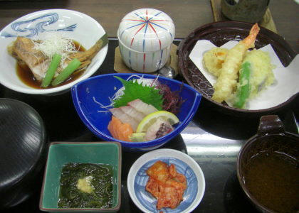 この日の夕食は割烹松活さんにて(これにミニ鍋が付いた夜定食を食べました)