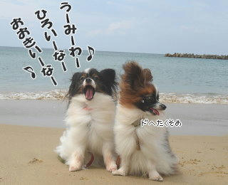 今年のお盆休みはほとんどエアコンのきいた室内で過ごしていた我が家です~(;^ω^A なのでエアコンなしの実家は暑く感じました。体が慣れると意外と自然の風で涼しくいられましたけどね・・・2匹ともはしゃいでいたので、特に暑かったかもしれません。お水よく飲んでました!とにかく水分補給はわんこにも大事ですね~~。海の歌、懐かしいですよね(^w^) 私も久しく歌ってなかったのですが、海に行ったらなんだかこの歌が頭に浮かんでました(笑)