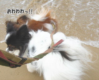 時おり足元に打ち寄せる波に仰天する風親子(゜m゜*)ぷっ
