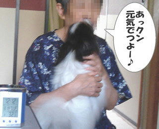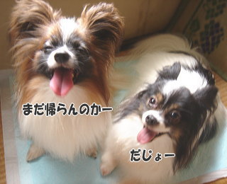 実家までは車のエアコンがんがんだったので、室内に入ると暑く感じました~~(;^ω^A 室温の表示は32.5度でしたが、時々自然の風が吹き抜けて、実は意外と涼しくいれたんです(^w^) でも動き回っていた2匹はやっぱり休憩が多かったですね・・水もよく飲んでましたし。2匹のためにもあまり長居はしませんでした。海、女性は皆さん、パラソルの下で長袖着て座ってました( ̄m ̄〃) お歌うたってるように見えてしまった私です(ノ∀`*)
