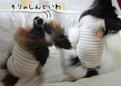 なんかですね、感覚が鈍ってます(^.^; これ作る間に私、マチ針を指に何回も刺しました!肩開きは出来るなら作りたくないですね~面倒!あらしの普通仕様に比べたら、ひと手間ふた手間…いやもっと余計な作業が必要になりますもん。でも脱ぐ時に激怒する風吹のために、少しでも負担の少ない肩開きにしてあげなくちゃ(^・^;) 冷えも禁物なので、そろそろ夜だけ洋服を…とも考えています。「シリだけに…」ウケていただけて嬉しい♪
