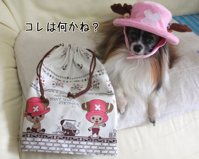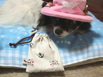 まずは巾着袋。我が家の風チョッパーが撮影のお手伝いをします♪