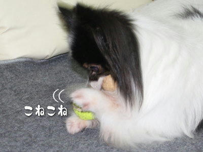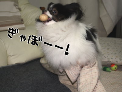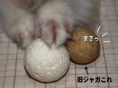 (≧3≦) =3 ほんとにその通りです~!でも実はまん丸ではなくて楕円形なんですけどね(^.^; 完全にまん丸には戻れないようです。え、このコキチャナイのを見てたこ焼き食べたい?( ̄m ̄〃)ぷぷっ キチャナクても何でも、あらしがコレを楽しそうに嬉しそうに持って来て見せてくれる様子を見ると、コッソリ捨てるのも申し訳なくて・・・捨てられませんね~~(´ー`) ジャガジャガもわかってて復活してる?そうかもしれませんね~(笑)