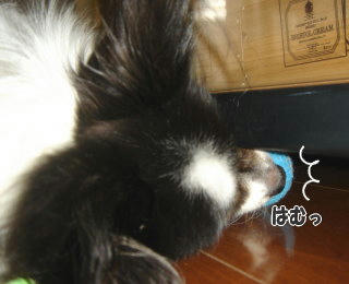 2個とも・・って欲張ってるのか、どっちかなんて選べない~~なのか・・・(。・m・)クス どちらにしても確かに器用な口ですよね!前足でコネコネしょっちゅうですよ(^w^) ボールをおでこ・・の時点でダメっぽいです。今までも何度か練習してみたのですが、顔をそらして落としてしまうんですよね~(^・^;) あらしはホント、無芸です。その分、普段が芸人ですがーε=(>ε<) プッー!