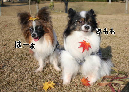 色づいた紅葉をくっつけられちゃったあっクン顔がひきつっていますね~(笑)