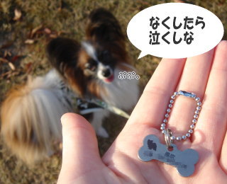 迷子札、危ないところでした!失くしていたらホントに泣いてたところでしょうねぇ( ̄▽ ̄;) ぱぴーくんの迷子札、どんなのかしら~♪我が家ももう一つ欲しいと思ってるんですよ(^-^) ハーネスを幾つか持っているので、イチイチ付け替えるのも面倒だし・・・ハーネス一つ一つに迷子札付けちゃえ!みたいな感じでね(^^*ゞ 安くて良さげなものを物色中です。