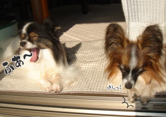 はい~(o^-^o) 縁側茶のみ劇場開幕ですよーー♪お待たせしました!(待ってない?)あくびはコレ、ほんとに連続して出たものなんですよ!うつるんですよ、わんこも。たぶん(笑)  あらしは黙ってイタズラさせてくれますね~~あとでしっかりご褒美(謝礼?)あげてます!新種、私もお気に入りなんですよ・:*ゞ(∇≦* )