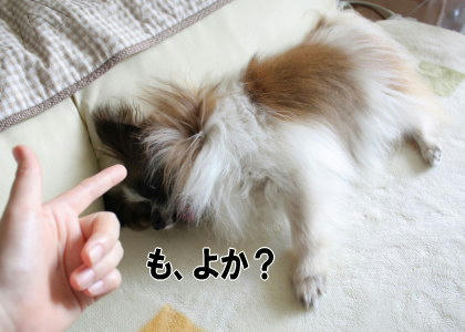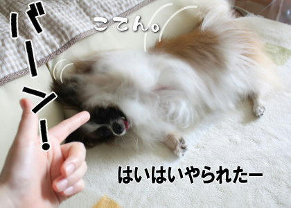 ( ̄∇ ̄*)ゞあはは。凄いですか♪ありがとうございます!キゲンがいい時はなんとか2発目までやってくれるんですよ(^w^) 滅多にないけど(笑)あらしに教えたはずが風吹の方が習得してましたからね~(゜ー゜;) バーン!て言ったら横で父ちゃんがこてん。って(≧3≦) =3 あらしはキョトンですよ。ぜひ悟空くんにもやって欲しいなぁ♪可愛いだろうなぁ(ノ∀`*) 大きいわんこでも全然大丈夫ですよ!「バーン」言いながらゴロンって転がして教えました(転がしたのはあらしだけど)なかなかゴロンしないので「オスワリ」「フセ」から段階をおってやっていたので、それで風吹もバーンて言うとまずフセから入るようになりました(笑)なんかあんまり死んだフリっぽくないんですよ実は(^.^;