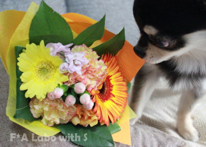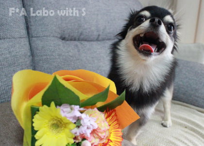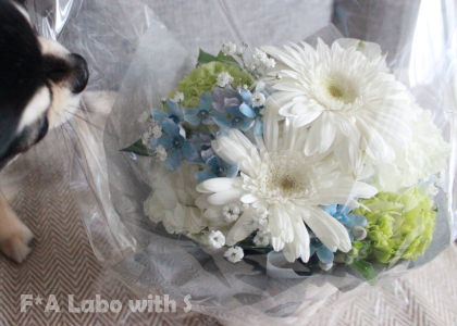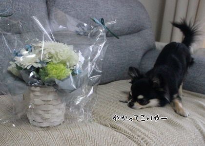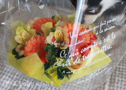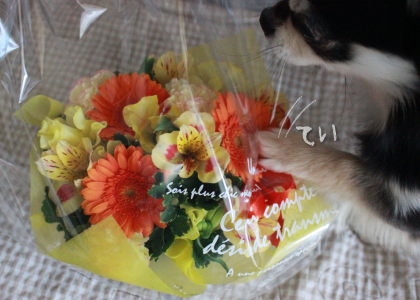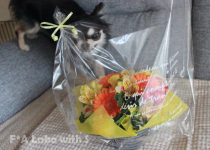 お花が気になり過ぎてラッピングフィルムの中にまで顔を突っ込む颯天(笑)