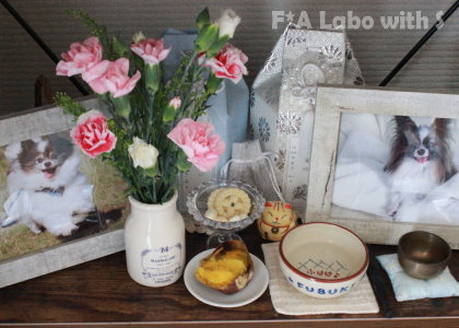 母の日仕様のお花とお供えはお芋さんとビスケット&ボーロ