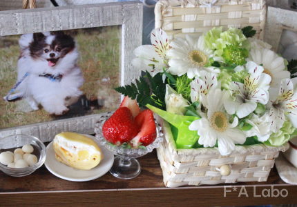 あっクンのもふもふを思わせる白いアレンジメントと、