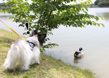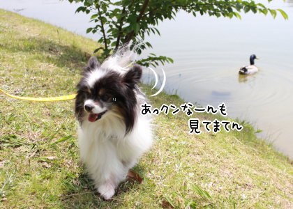 お散歩大好き、ママさん大好き、鴨は見えないあっ君。