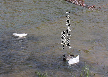 カモを先頭に、ガチョウが2羽着いてゆくと言う光景。