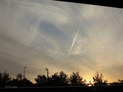 飛行機雲と四方八方に散らかった雲。何か変( ‥)