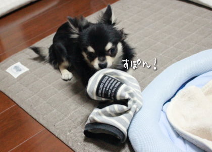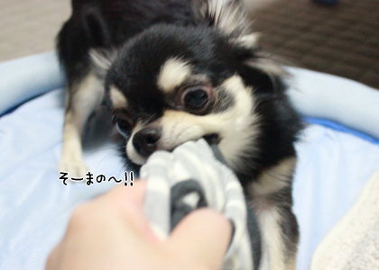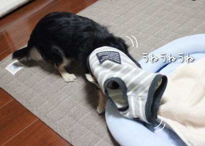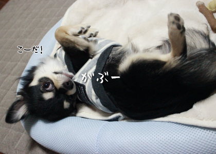 で、脱皮した洋服をおもちゃにカミカミ始めたので