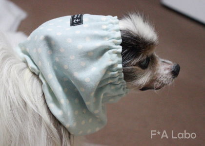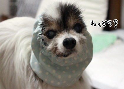 スヌード姿、日ごろ見慣れているパピヨンの大きな耳がなくなって別の生き物みたいで可愛いんですよね~~(´艸`*)