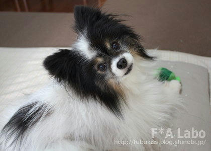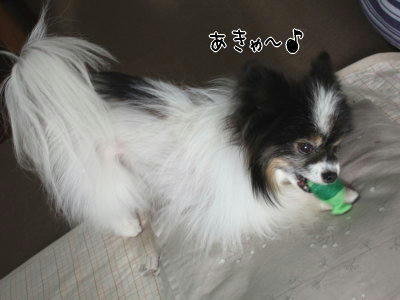 冷えないうちにドライヤーで乾かして、今度はおもちゃで暴れようと