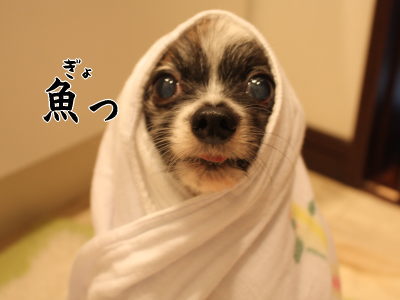 浴室に持参したおやつの残りを食らうお魚ほっかむり風ちゃん。