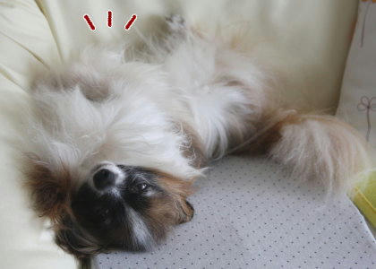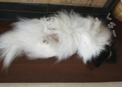 イブは時々へそ天でお手手つっぱらかして寝てます^^;堅い床で寝るのも好きみたいです。ひんやりして涼しいのかな?