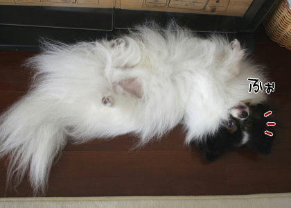 怒り狂うラッピングあらし、ギャップが面白いですよね(^w^) 風吹、ナイス乱入!(゜ε゜*)ぷっ 風吹って、そのままのあらしには絶対に抱き付いたりとか、寄り添ったりとかしないのに、例えば毛布で背中が隠れてたりするとわからなくなるのか、あらしの背中部分に寄りかかったりすることがあるんですよ~。それと同じで、ラッピングされていたので、包まれた部分はあらしの背中なんて思わなかったのかもしれません~~私の勝手な解釈かもですけど(^.^;