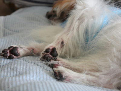 わ~ぉ肉球パラダイス(〃ω〃)左足がターゲットです(足裏の毛は抜け落ちてツルツル…)