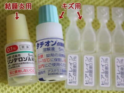 結膜炎用をキズの方に使うのはマズイそうで、間違えないように念押しされました。