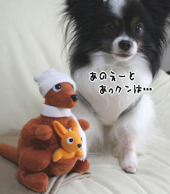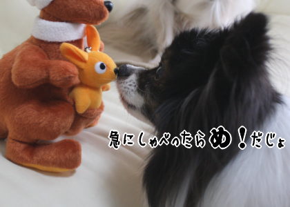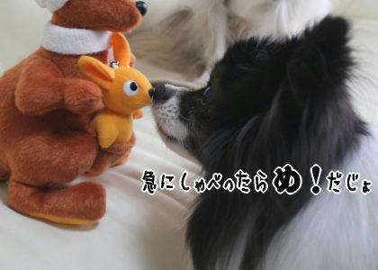 少々ビビリつつもやっぱり遊びたいあっクン、再び子カンガルーを咥えると