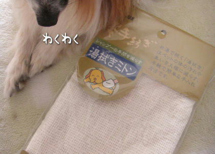 このミトン、ぬるま湯に浸してしぼり、拭き拭きするだけ。かなりラク。