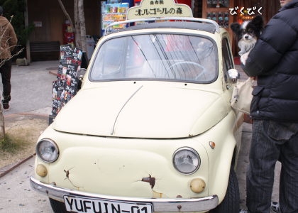 可愛い自動車が看板代わりだったり♪(あっクンは運転席のぬいぐるみにどん引き)