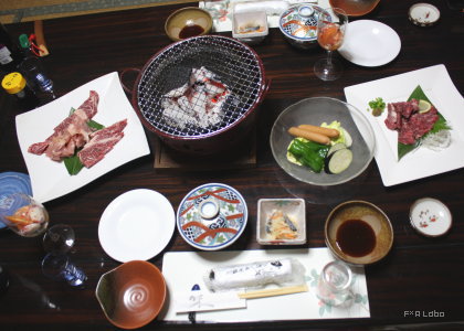 こちら、夕食の一部です!炭火焼肉と馬刺しがメイン。