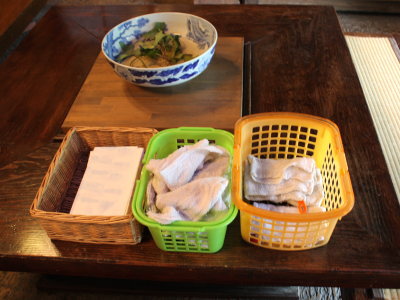 旅館の玄関にはわんこ用の足拭きタオルが常備されてます。