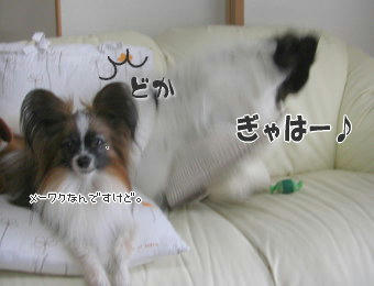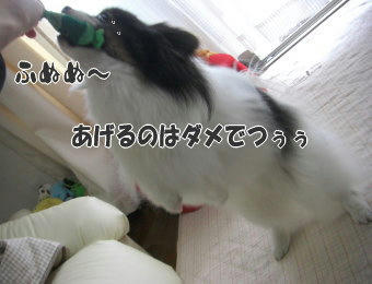 風吹は・・・あらしが遊んでる時、私が相手して遊ぶと、自分も!って遊びもしないボーロ咥えて乱入して来ることもありますよ(^w^) でも大抵は、ただ見てるだけ~ってことが多いかもしれません。たまに文句とか言いながら・・・!眠い時もあるようで、知らんぷりして寝てることもあります。今回は眠かったみたいで、寝ていたのですが、あらしが邪魔して起こしてました(^.^; 楽しそう~に遊んでいると気になるんでしょうね(^-^)