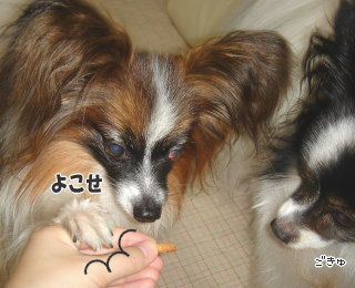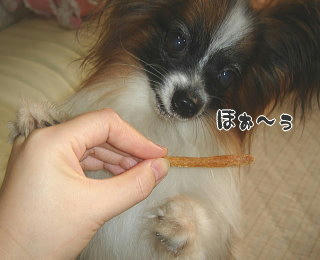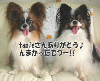 手作りのおやつ3種類ずつ入ってて、可愛いオリジナルシールで封がしてあったんですよ~!2匹ともそれはそれは喜んで食べてました!特に風吹の様子が物語ってるでしょ?(*^m^*) エルフちゃん、残念~もらい損ねちゃったんですね(^・^;) でもでも!↓tamieさんが、次回は大盛りでくださるそうですよ!楽しみですね♪一つ一つ丁寧に作られてて愛情を感じますよ~~