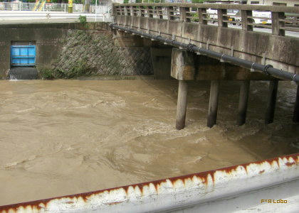 いつもは水量も少なく川底が見えていたりするのに…(参考記事)