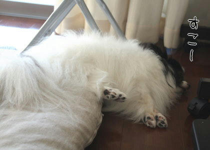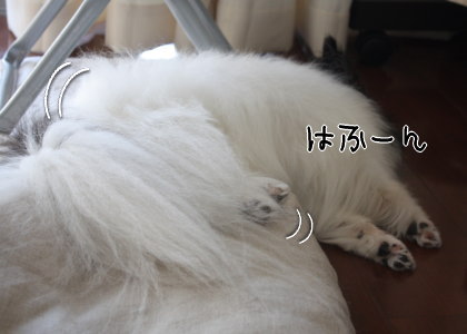 はい!まさしく行き倒れスタイルでございます(≧ω≦。)プププ ウォルフィくんのはカエルさんみたいなアンヨだけど、あらしはこの通り、真っ直ぐピーンなんですよね(^w^) 一見しんどそうですが、本人的にはどうやらラクらしくて、気が付くとお昼寝後半は大抵こうなってるんですよ(クッションやベッド限定、あ、お布団からもはみ出してます) 撮りたくなりますよねーー!でも気付かれちゃうんですよ~(´ε`;) 何度チャンスを逃したことか(笑)