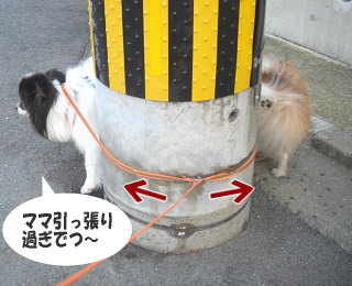 この体重差が逆ならOKだったんでしょうけどね(^.^; 風吹が引っ張ってもあらしはほとんどビクともしませんから(笑)電柱のアレ、別々のリードでもしょっちゅう、あっちとこっちに行っちゃってますよ~。