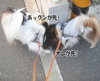 2頭引きリード、カップラーと言うらしいですよ。私もいただいて初めて存在を知りました(^w^) ほんと、いいもの持ってる!って喜んで使ってみたのに、どうやら家には使いこなせないようで・・・ガッカリです。電柱のマーキング、たまに2匹同時なことがあって笑ってしまいます。風吹は結構、根に持つタイプですよ~~ちょっと怖い目に遭った場所とか物とか、すごく用心するんです。記憶力がいいんでしょうね~( ̄ω ̄)