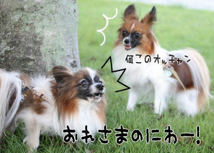 そうですね♪肩乗りもキックも同じです~~( ̄ω ̄) でも共通点と言うならぱぴーくんとも結構多いですよね(笑)風吹の若い頃を思い出させてくれるので、なんだか見ていて嬉しいんですよ♪(^.^;はは。蘭丸くんのビックリ顔、まさに「何このオッチャン」って顔してますよね!せっかく寄って来てくれる蘭丸くんに、何度も吠えて驚かせてしまったんですよ・・・また嫌われたかも(悩)でも可愛い3ショットが撮れて良かったです(o^-^o)