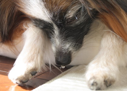 ソファの上かわんこベッド、今時期はコタツ布団のヘリ(ママヒザも)