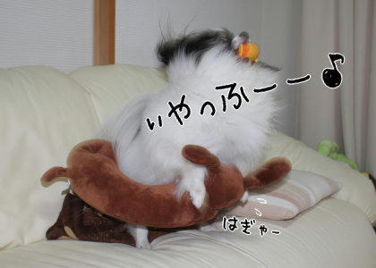まぁ!ロバ太郎さんがいらっしゃる!?ウォルフィくんはセクハラしちゃうんですね~~( *゚艸゚*) ちょうど抱き付きやすい大きさですもんね。てっきり風吹も同じことをすると踏んでいたのですが、こちらの期待、いえ予想を裏切って模範的な使い方をしてるんですよね~(^w^) 元々何かに寄りかかって寝るのが好きな子だったので、本官さんは大きさも肌触りもちょうと心地良かったのかもしれません。安心できるみたいです(´ー`) 風吹の安眠を見守る役目のほか、あらしの舞の友と言う役目も果たして、毎日大忙しの本官さんです(笑)