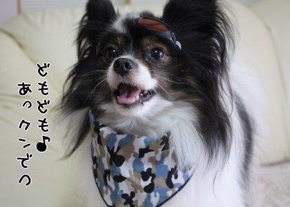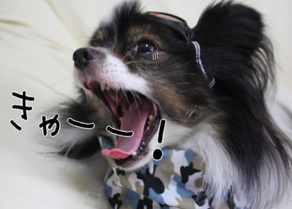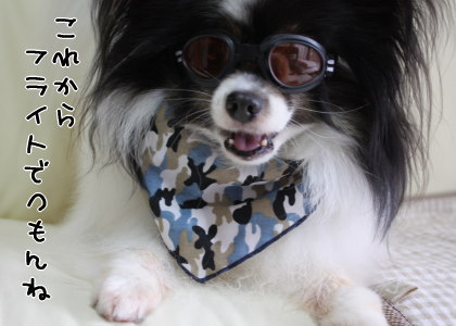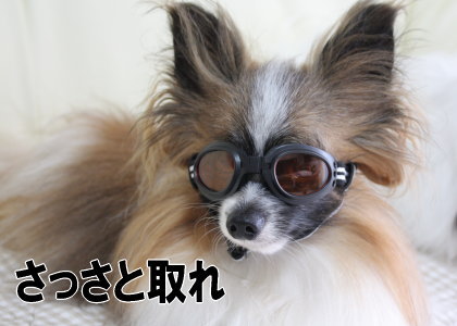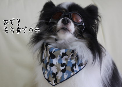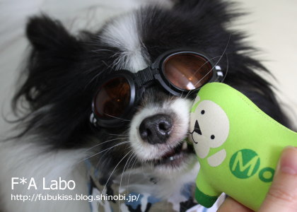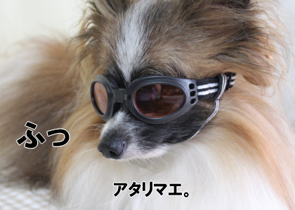 でしょでしょ♪なんかカッコイイでしょ♪(親バカ炸裂!)でもこれ静か~に怒ってます(;^ω^A バンダナまで巻くヨユウが(私には)なかった!ゴーグルを目元に下ろすのが精一杯でした。あらしもおもちゃに釣られて頑張ったけど、隙あらば前足ではずそうとクシクシやってましたからね~(^.^; こんなにイヤがるもの、実際使う機会ってないですね( ̄ω ̄) 一応、UVカットレンズで、わんこの瞳を紫外線から守ってくれるというものなんですが…夏場は極力外出しない我が家(早朝か夕方限定!)これって必要ないですよね~~(笑)わんこの世界は白黒って少し前まで聞いてましたが、今は多少の色は見えてる子もいるらしいですね!風あらは…どうかしら(゜m゜*)