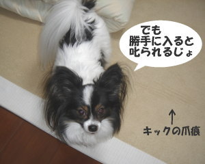 (* ̄m ̄) ププッ オモチャの詰め合わせ、あらしがこのイタズラをされるのはもう何度目でしょう。 パパの部屋に入るとカーペットでスリスリ~は必ずやるんですよね~。あらしがキックキックするもんだから、写真のようにハッキリ爪痕が残っちゃって、それが証拠になっちゃうことも(^.^; でも、ママがお掃除する時に一緒に入ったって言えば大抵、許してもらえるんですけどね(^w^)