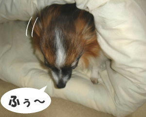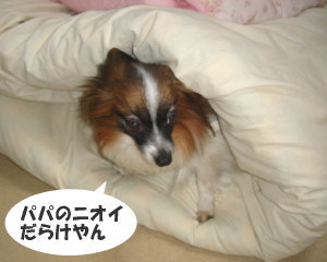 薄暗い部屋の、パパのお布団の中にうごめく犬影が!