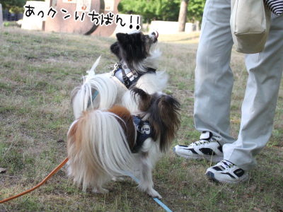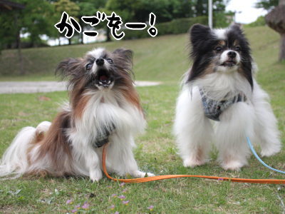 心地良い風を感じながらいつもの広場に着くと、なんと風ちゃん「下ろせ」とジタバタ!