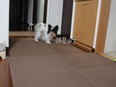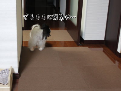 風ちゃんが床で滑ったりしないようにと、一部だけ敷いてみたタイルマット…