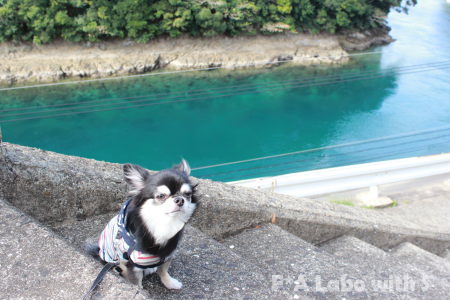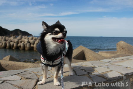 水平線の美しい海を眺めながら颯ちゃんもお散歩を