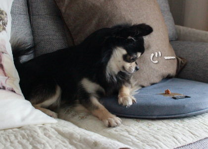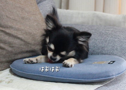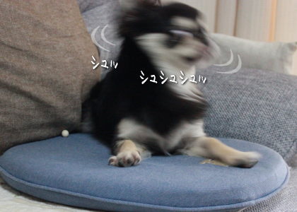 遊んでるうちにクッションごと落ちるも唾液でくっ付くボーロさんw