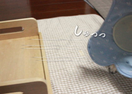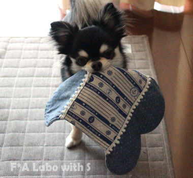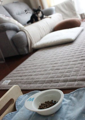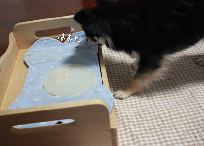 颯ちゃんが咥えているのはランチョンマット。